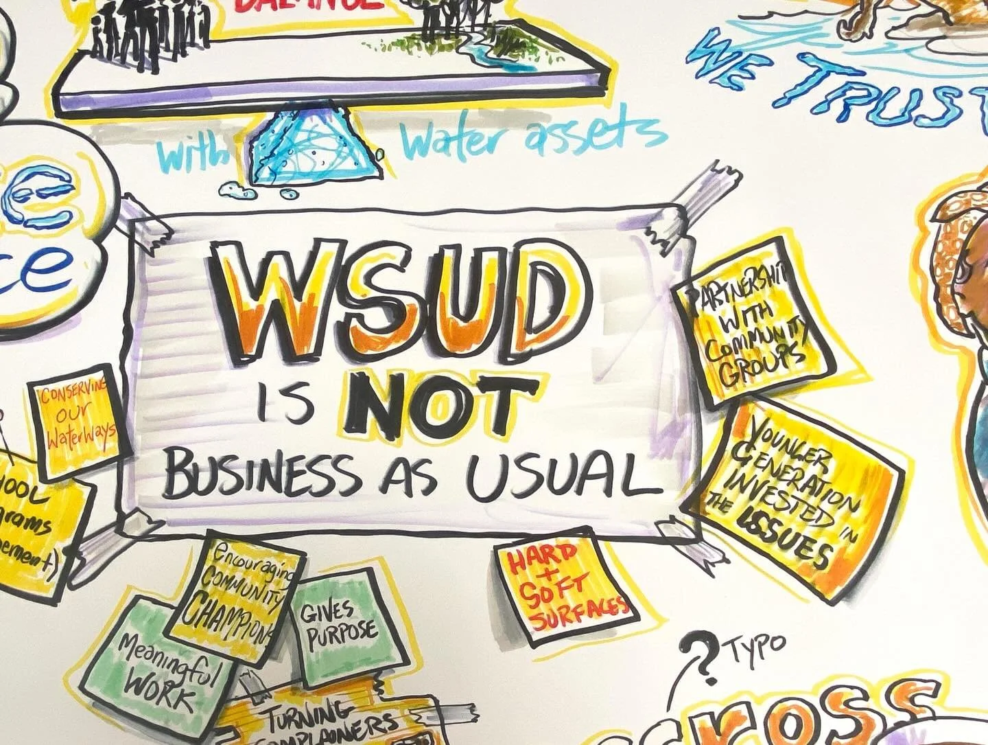 It required 4 rooms to have 3 large-scale drawings ready for viewing by participants in a series of workshops. The day started at 8.30 with all room preparations drawings completed by 1.30pm. Live scribing sessions following for three hours in the afternoon.
